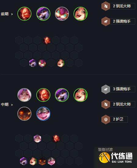 前期2驯龙羁绊优先级最高,再利用小炮搭配金克丝或赛娜做2炮手,装备交给小炮到概念股,前排单挂布隆,5级再上锤石娜做2护卫。除此之外,还可以用赛娜、慎和瑟提做3怒翼,再补充2炮手或是2格斗来过渡。其他情况做2狂战拿永恩过渡也可以,或是3怒翼用瑟提过渡。这几套都是前期比较强势的过渡组合,基本能保证2阶段多赢少输,装备合适就直接打连胜。