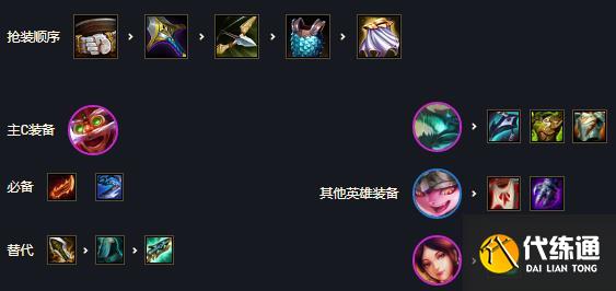飞机的羊刀和巨杀是必备的,可以满足切肉能力,第三件做无尽或是杀人剑优先,其次考虑科技枪或者水银。琴女作为副C,必备一件回蓝装,青龙刀、羊刀、蓝buff或是电刀都可以,第二件必备大天使,第三件出任意AP装。艾达丝作为团队唯一T位,肉装要求也比较高,板甲和龙牙都是必备的,第三件优先做狂徒,其次捡垃圾。