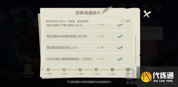 共100活跃值,领取一块奇遇碎片