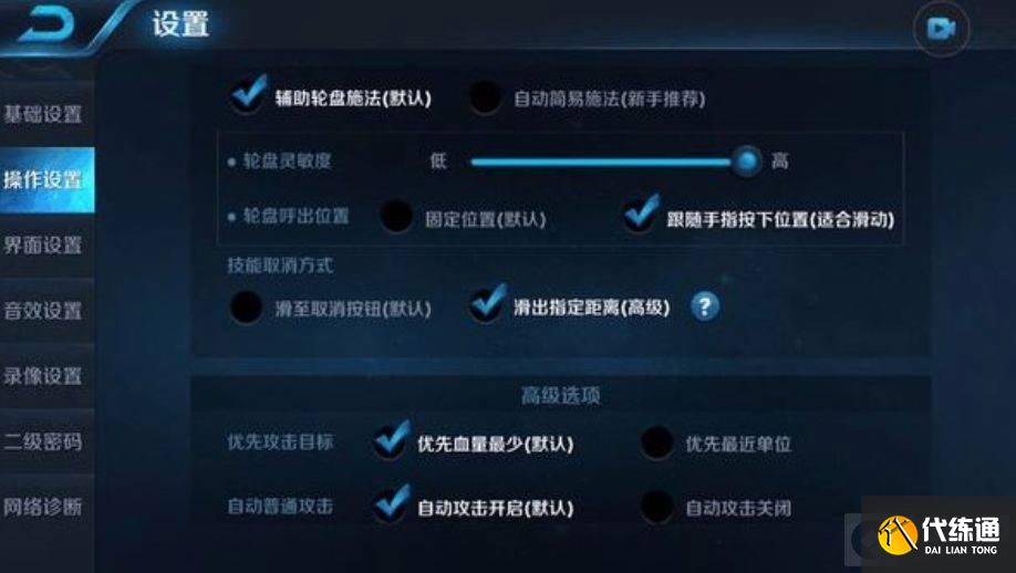 3、高级选项在高级选项中最主要的就是点这几个,例如自动普通攻击开启后,你可以一边看装备一边打野。这就是自动普攻的好处。