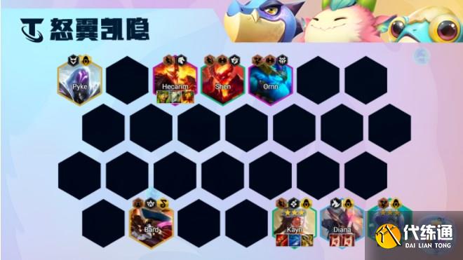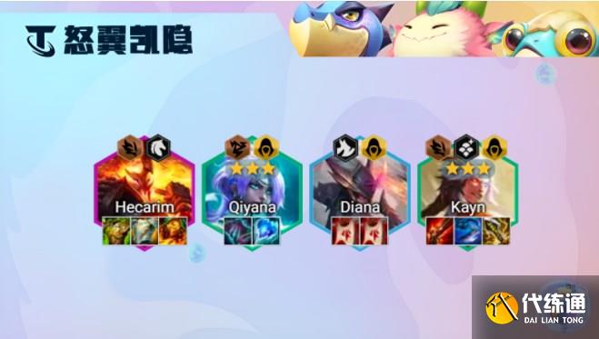 这套阵容核心在于4刺客3怒翼2风暴羁绊,装备控制能力非常强。前排有赫卡里姆的大招AOE控制+奥恩技能羊控制+风暴龙的风暴控制+奇亚娜技能小控。4大控制能够保证凯隐有非常不错的输出空间。