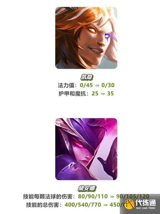 法力值的减少,直接让凯隐的技能启动大幅度提升,其次双抗的提升,能够让凯隐的容错率和坦度提升。其次黛安娜的技能伤害全等级提升,当前版本凯隐为主C的阵容是可以玩的。