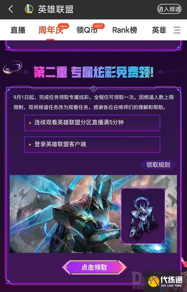 ?进入后也是要在英雄联盟直播间看五分钟,并登录一次游戏就能领取炫彩。