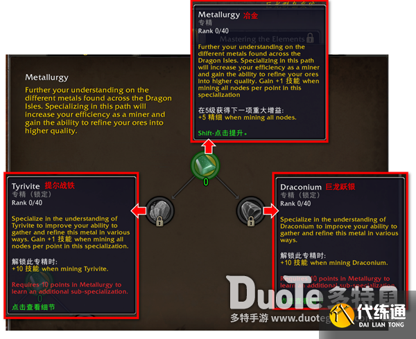 进一步了解巨龙群岛上的各种金属。专攻这个子专业将提高作为矿工的效率,并获得更高的提炼矿石的能力