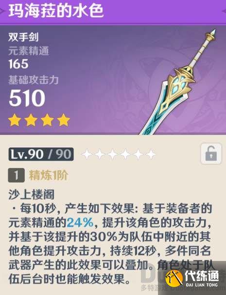 1、玛海菈的水色和西福斯的月光是同一个系列的武器,武器特效是按照元素精通的32%提升攻击力,并且基于该效果30%为队友提升攻击力,10s触发一次,持续12s,效果可以与该系列其他的武器叠加。