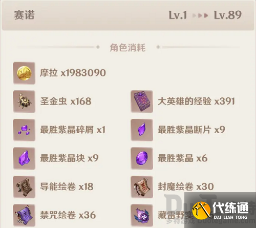 1、角色升级到89级需要摩拉1983090,圣金虫168,大英雄的经验391,最胜紫晶碎屑1,最胜紫晶断片9,最胜紫晶块9,最胜紫晶6,导能绘卷18,封魔绘卷30,禁咒绘卷36,藏雷野实46。
