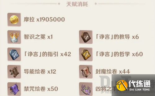 2、天赋消耗材料有摩拉1905000,智识之冕1,诤言的教导6,诤言的指引42,诤言的哲学60,导能绘卷12,封魔绘卷44,禁咒绘卷50,凶将之手眼10。