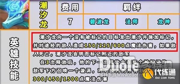 2:羁绊为,碧波龙,法师,龙神,费用是七费卡,这个索姆向着一个没有被标记的目标发出潮汐并且施加标记,并且对途径的敌人造成一定的魔法伤害,如果敌人死亡了,就会转而标记附近的敌军,同时在三次释放之后,他的下一次释放会在每个被标记的脚下生成一个漩涡,对范围内的敌人造成高额的魔法伤害;