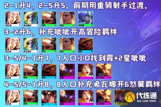 2阶段:前2-1拉4人口,2-5拉5人口,跟传统的冒险霞过渡也是一样的,霞的装备优先给伊泽瑞尔打工过渡,搭配重骑风暴羁绊过渡。