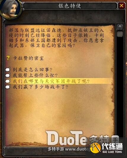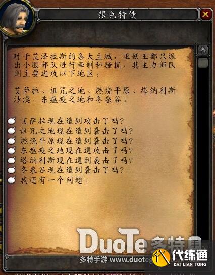 首先我们需要和NPC确定当前天灾入侵的地图,在东瘟疫之地礼拜堂的银色黎明帐篷找到NPC【银色特使】(就是接KLZ黯血王子任务的那位),与之对话后选择【我们在哪里与天灾军团开战了呢?】,即可查询当前哪些地图有天灾入侵的刷怪点(有浮空要塞的地图就是有刷怪点的)