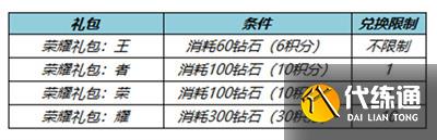 荣耀礼包:耀:打开后必得铭文碎片*60,累计开10次必得有你才赞回城特效自选宝箱*1