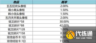 打开后可随机获得以下奖励之一:五五狂欢头像框、萌小离头像框、韩小信头像框、五月天开黑头像框、双倍金币卡:1日、双倍经验卡:1日、铭文碎片*158/128/88/58。