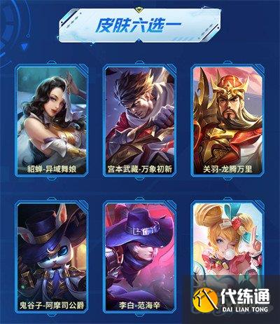 孙尚香-水果甜心、关羽-龙腾万里、宫本武藏-万象初新、李白-范海辛、貂蝉-异域舞娘、鬼谷子-阿摩司公爵