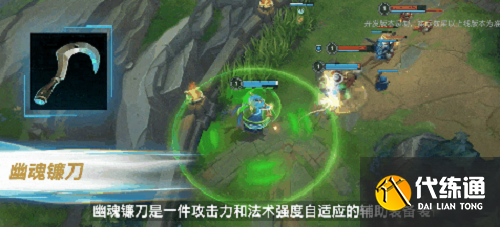 1、幽魂镰刀可获得自适应属性,因此AD和AP英雄都可以使用。附近有友军时,你对英雄或防御塔造成的任何技能伤害或攻击都会消耗一层充能,并产生金币。赚够金币后,可将这件装备变为鬼影新月。