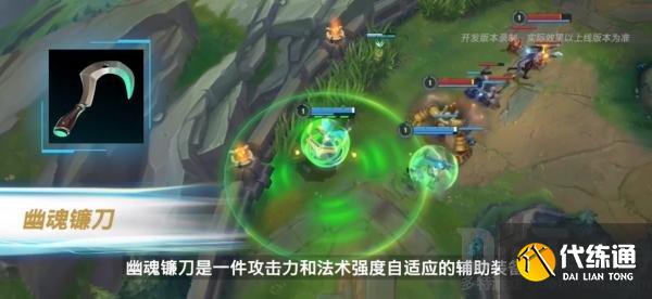 幽魂镰刀是专门为辅助英雄设置的任务装备,攻击敌方英雄或建筑,赚取金币,并将它升级为鬼影新月及黑雾巨镰。升级完毕后将获得强大的被动效果,法术技艺:玩家击败或助攻敌方英雄时,可大幅缩减主动装备的冷却时间。