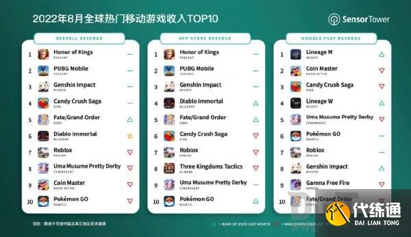 Sensor Tower 商店情报数据显示,2022年8月腾讯《王者荣耀》在全球 App Store 和 Google Play 吸金超过2.22亿美元,蝉联全球手游畅销榜冠军。来自中国iOS市场的收入占94%,海外市场收入占比为6%。