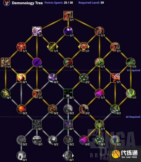 4、后续练级点数则可以点出地狱火线路,或者点出引导恶魔之火再点地狱火线路。 (目前测试服招地狱火减片不工作,地狱火献祭增伤还是30%,笔者是点烙印练级的)