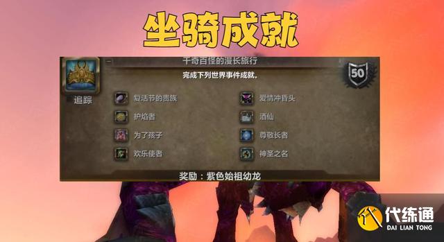 WLK版本有一个成就名为《千奇百怪的漫长旅行》,玩家做完这个成就便可以获得一款紫色始祖幼龙,这款坐骑是除了JJC和团本之外唯一获得310%坐骑的机会。而这个成就中就包含美酒节期间的成就。