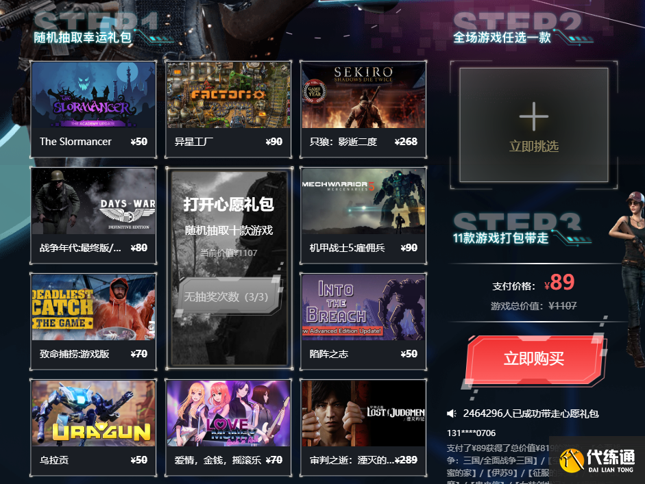 快来一起抽取幸运礼包吧!原价1107元的游戏现在只需要89元呢,并且还包括爆款游戏只狼、机甲战士5、审判之逝、经典战旗陷阵之志!!!
