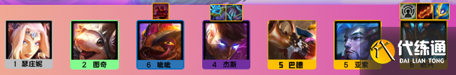 9人口阵容:瑟庄妮、图奇、呲呲、杰斯、巴德、亚索、熬兴