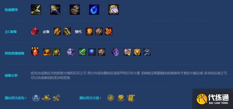 开局优先拿反曲之弓或者暴风大剑,优先合成疾射火炮和无尽之刃,开局野怪掉落奥拉夫或者2阶牌库出奥拉夫为最佳,前期让奥拉夫阵亡获得攻击力加成,还可以优先抢到合适的装备;五人口永恩替换孙悟空,补瑟庄妮即可;六人口优先找到四屠龙勇士,同时搭配上永恩和蕾欧娜开狂刃战士和护卫;