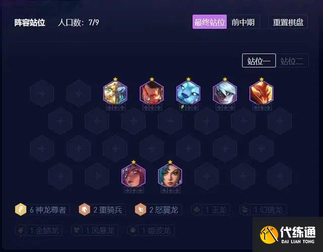搭配的羁绊有:6神龙尊者、2重骑兵、2怒翼龙,如果上八人口,可以将卡尔玛换成亚索,然后再上一个重骑兵。