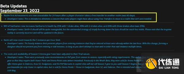 玩家角色免费转移到另一个服务器后,24小时内(原为60天)成就系统无法使用。