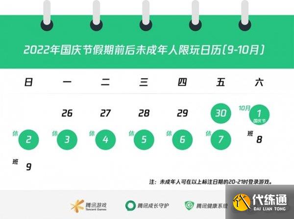 9月30日-10日7日(周五及国庆节假期)每日的20时至21时之间,未成年人可登录游戏。