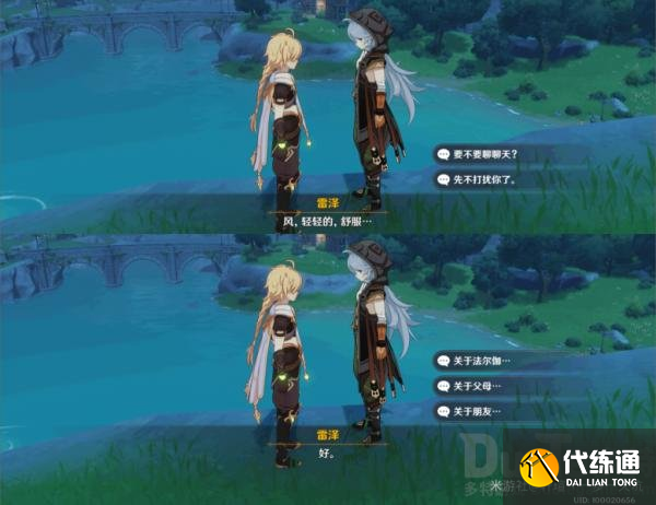 雷泽在蒙德城外的小山坡上,也正如他所说的:“我是,城里和城外的,桥。”