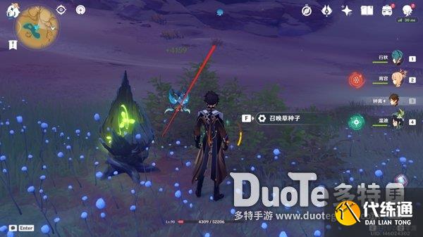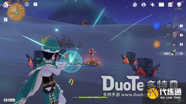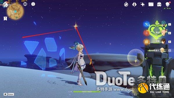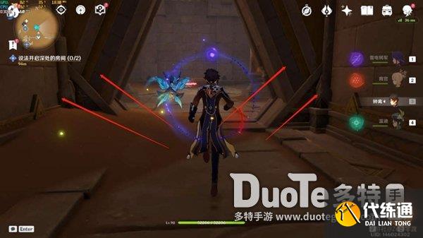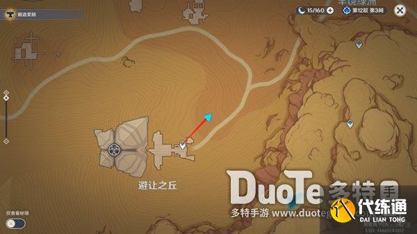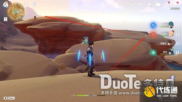 下面这个是小伙伴们可能会没去走到看到的一个打怪的限时挑战,我们来到荼诃落谷左下角的传送点往箭头方向走到山崖差不多正底下抬头用四叶印飞上去,接着走到最顶部的平台上中间就看到了