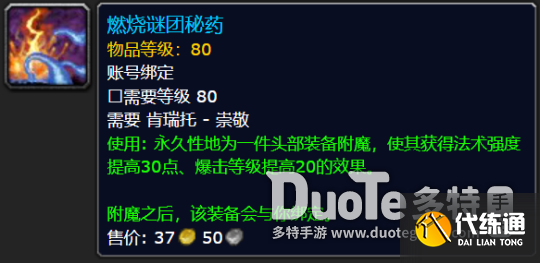 使用: 永久性地为一件头部装备附魔,使其获得法术强度提高30点、爆击等级提高20的效果。