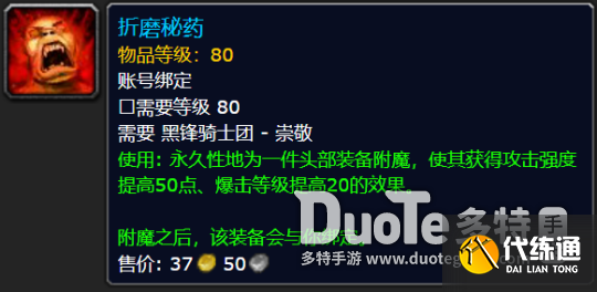 使用: 永久性地为一件头部装备附魔,使其获得攻击强度提高50点、爆击等级提高20的效果。
