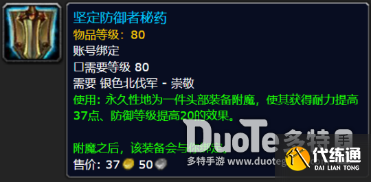 使用: 永久性地为一件头部装备附魔,使其获得耐力提高37点、防御等级提高20的效果。