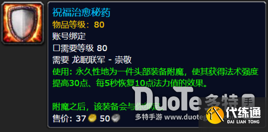 使用: 永久性地为一件头部装备附魔,使其获得法术强度提高30点、每5秒恢复10点法力值的效果。