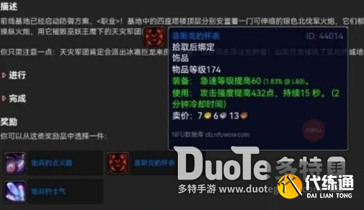 想快点换掉SW的过时极品吗,想提前入手P1阶段的准毕业饰品吗?魔兽怀旧服还在练级的玩家们可以前往冰冠冰川,完成北伐军前线的任务链,即可获得物理或法系最强任务饰品,属性爆杀灰片古颅。建议大家尽量在开始刷英雄本前完成任务,配合牌子饰品,整个P1阶段都不用发愁了。