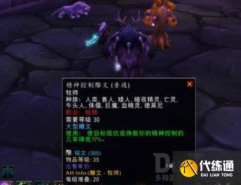 10人教官有两个宝珠让玩家控制小怪,但是25人必须有牧师(至少2个),而没有精神控制雕文的牧师,心控失败率实在太高了,打上雕文后效果立竿见影,小怪基本摆脱不了控制,命中率100%。只要小怪牢牢掌握在玩家手中,这个BOSS通过率就是100%,本身也没什么杀招和难躲的技能,直接轰杀就完事了。但是真正的难题才刚刚开始,很多人注意到该雕文的价值,早就把拍卖行的货扫空了,然后直接在世界上叫卖,价格高达200金。