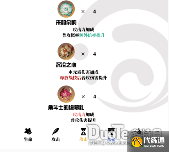 1、四沉沦:这是水元素角色通用的圣遗物套装,装备以后可以为妮露增加15%的水元素伤害加成,而且释放元素战技以后额外增加普通攻击的伤害,而妮露可以完美的契合这套圣遗物,所以非常推荐 使用。