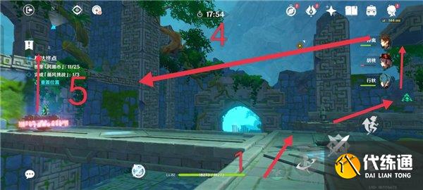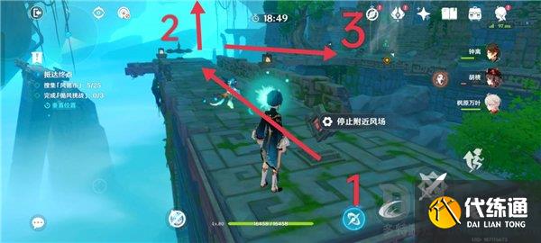 4.朝底部走,底部有挑战。首先朝1处关闭风场,再逆时针如箭头所示收集,挑战完成后改变风场向上飞。
