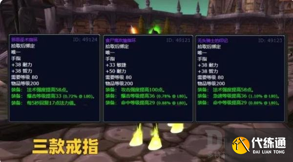 BOSS会掉落3款200等级的戒指,分别对应治疗职业,敏捷系DPS以及法系DPS。虽然这些戒指的等级只有200级,在P1团本开放之后已经没有什么优势了,但是这些戒指的属性都是非常优秀的。