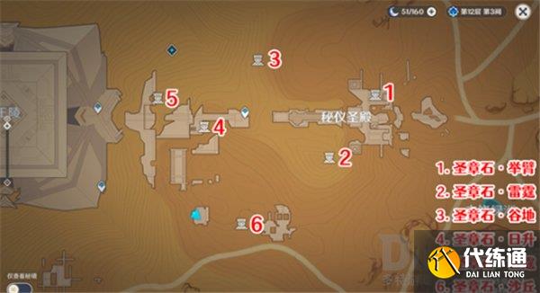 秘仪圣殿西侧区域圣章石位置如图所示,一共有六个。