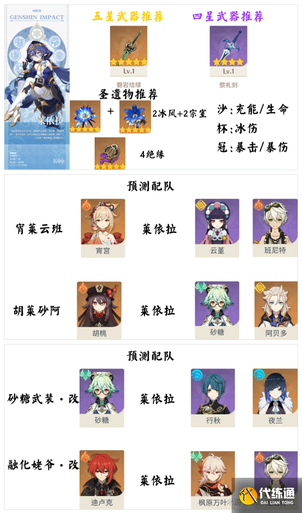 圣遗物和武器是参考行秋预测出的,莱依拉为单手剑角色