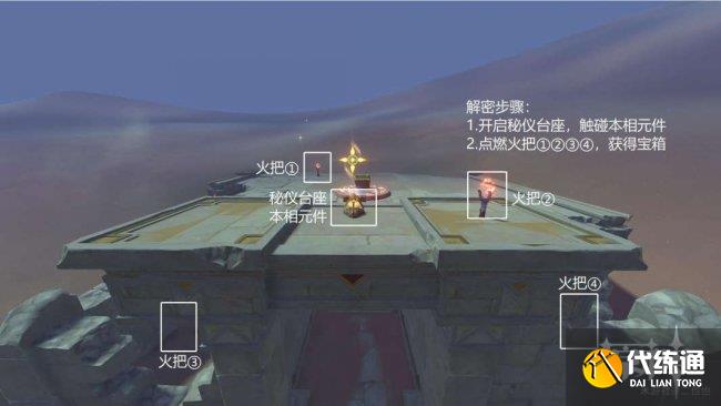 开启秘仪台座,触碰本相元件,显现并点燃图中指引的4处火把,获得宝箱五