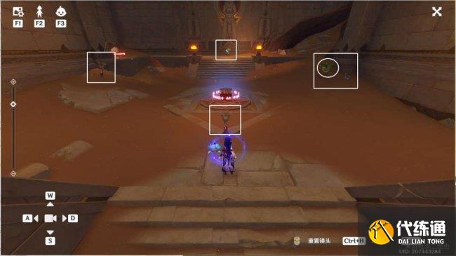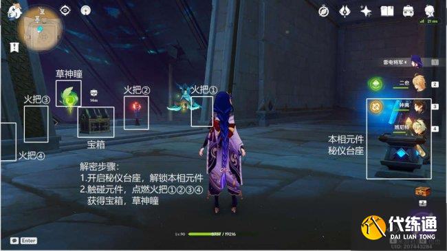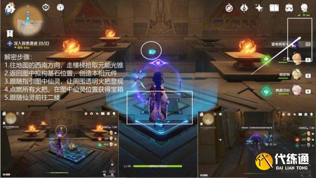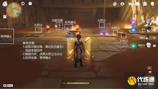 按图中指引,使用草元素,活化三乘种子,使用雷元素,利用三乘种子,显现火把,点燃图中指引的4处火把,获得宝箱十
