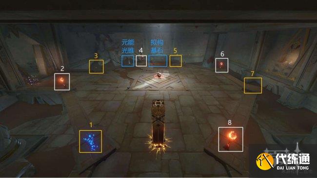 在平台下面,拾取元能光锥,靠近拟构基石,创造本相元件,触碰元件,靠近图中标记①③⑤⑦的4处黄框,点燃隐藏的火把,点燃8个火把,获得元能火种