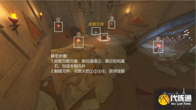 按图中指引,使用草元素,活化三乘种子①②,使用雷元素,利用三乘种子①②,显现火把①②③,使用风元素,吹散松散的沙堆,点燃图中指引的4处火把,获得宝箱二