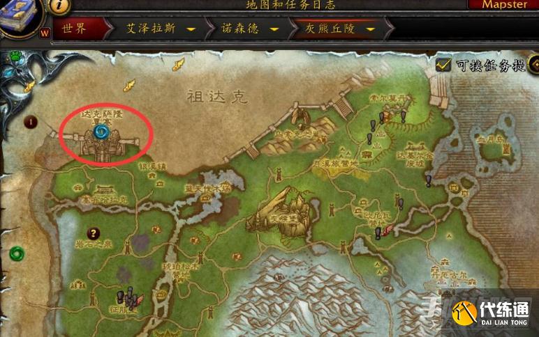 达克萨隆要塞在诺森德的灰熊丘陵,玩家来到灰熊丘陵后,在地图的左上角可以看到一个城堡,坐标(29,85)附近,这里就是达克萨隆要塞。