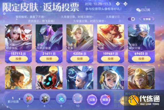 此次投票活动时间为:10月28日—11月3日,而在投票开启的第一天,皮肤的投票情况就出现了断层式的差距。截止28号下午一点半,孙悟空的孙行者得票已经接近47万票,瑶瑶领先,领跑投票榜第一。而排名第二的是孙尚香的异界灵契,票数接近27万,和孙悟空的孙行者差了20万票左右,第三是诸葛亮的时雨天司,票数在24万左右。