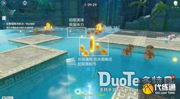 1、利用「神里流·霰步」。在水面上快速移动,拾取冒险币获得积分。