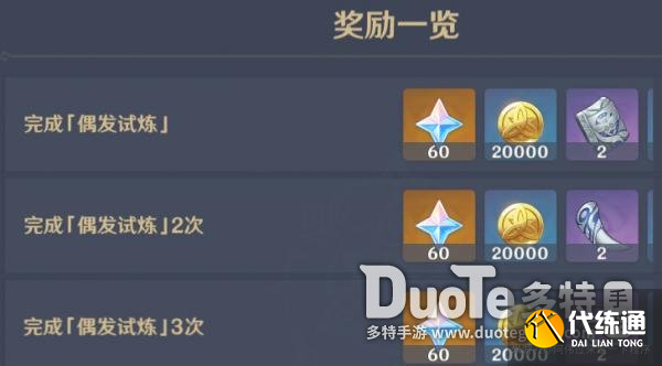本次试炼的每个关卡每个人都不一样,分别为前四天各关卡类型中随机选择3关。旅行者们需要重复完成三次「偶发试炼」才能获得全部奖励