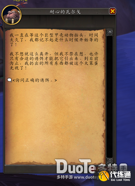 巨壳可汗无法被攻击,询问旁边的海象人耐心的瓦尔戈可以得知需要合适的诱饵才能把它引诱出来。